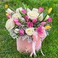 Корзина фруктов с красными тюльпанами
