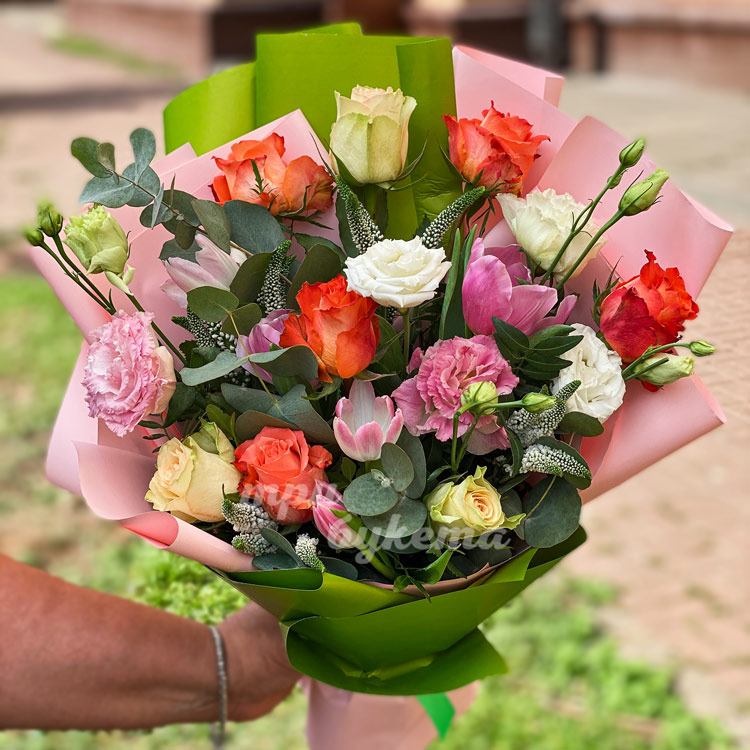 Букет из роз, эустом и тюльпанов