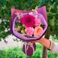 Герберы и хризантемы в розовом сизале