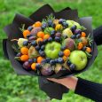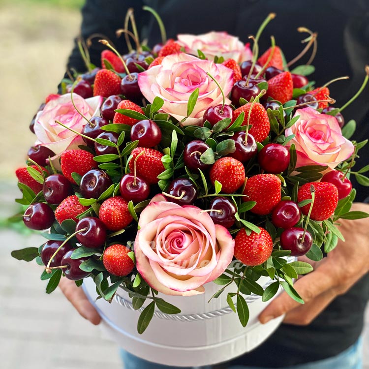 Коробка с клубникой, вишней и розами
