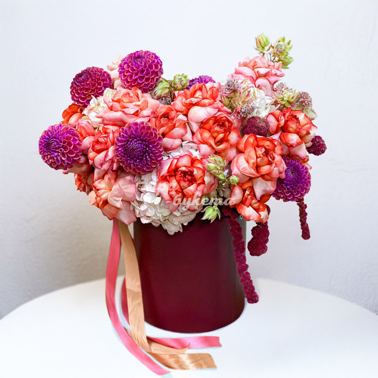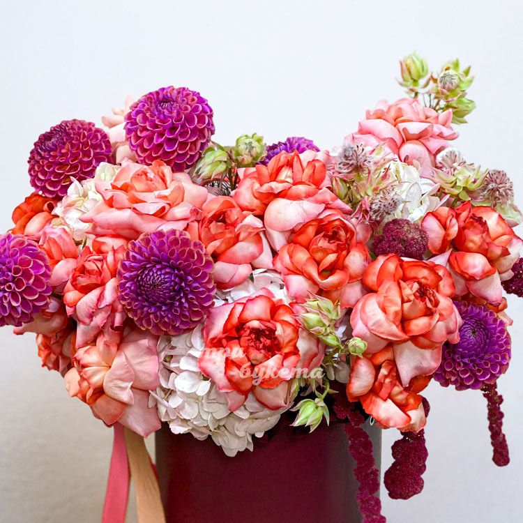 Коробка ярких французских роз и георгинов