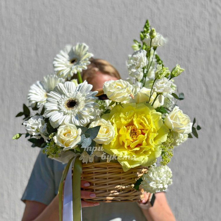 Корзина белых гербер с желтым пионом
