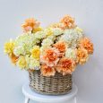 Персиковые розы с синими гортензиями в корзине
