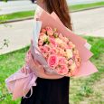 Пышный букет из розовых роз и гвоздик
