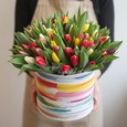 Ромашки и ирисы в шляпной коробке