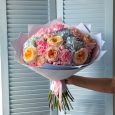 Розовый букет гвоздик и роз с гортензией